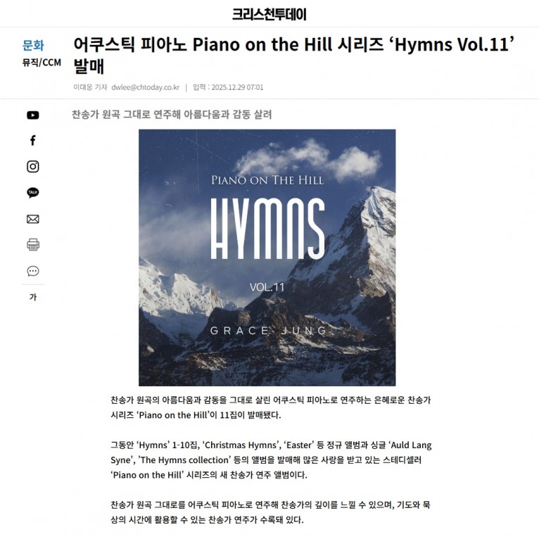 [기사] 어쿠스틱 피아노 Piano on the Hill 시리즈 ‘Hymns Vol.11’ 발매(크리스천투데이)