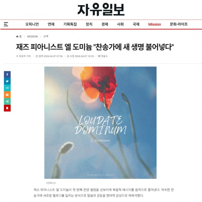 뮤직타임 [기사] 재즈 피아니스트 엘 도미늄 찬송가에 새 생명 불어넣다(자유일보)