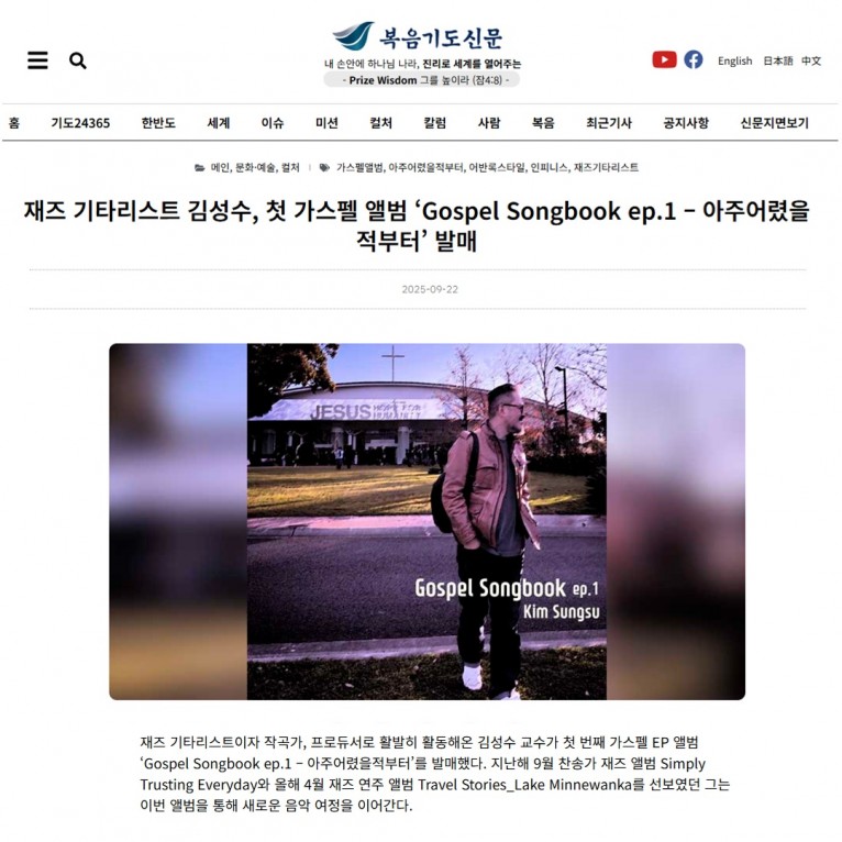 [기사] 재즈 기타리스트 김성수, 첫 가스펠 앨범 ‘Gospel Songbook ep.1 – 아주어렸을적부터’ 발매(복음기도신문)